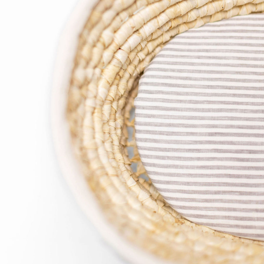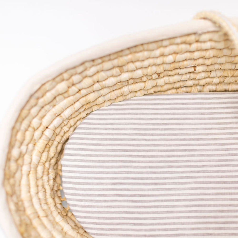 Foxtrot Home French Flax Linen styled in a baby's bedroom with Cactus Cot Sheet and Bassinet Sheets.
