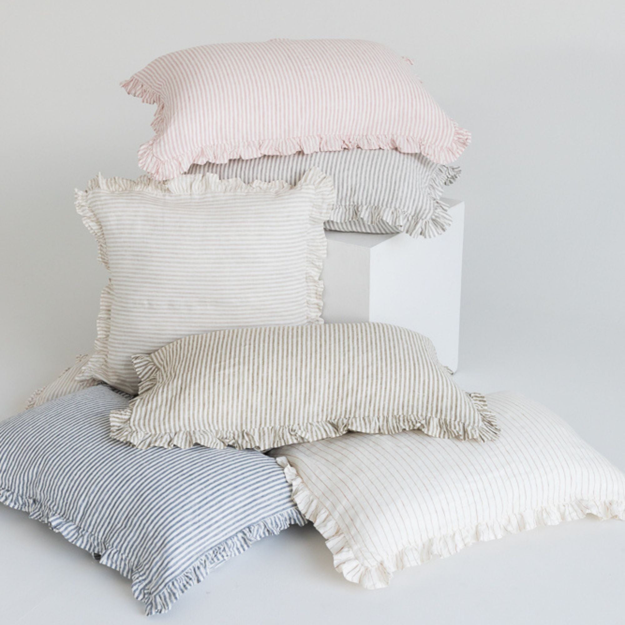 Add an instant touch of the 'Wow' factor to your bedroom with our beautiful new Ruffles Collection! This range of French Flax Linen pillowcases and cushions provide instant texture and a hint of whimsy to your bed. The classic Hampton-esque feel in our Grey Stripes Ruffles elevates your home and brings everyday luxury to your spaces. Beautifully textured and stonewashed for softness, we love Grey Stripes with Powder Blue, Sage Green & Lilac.