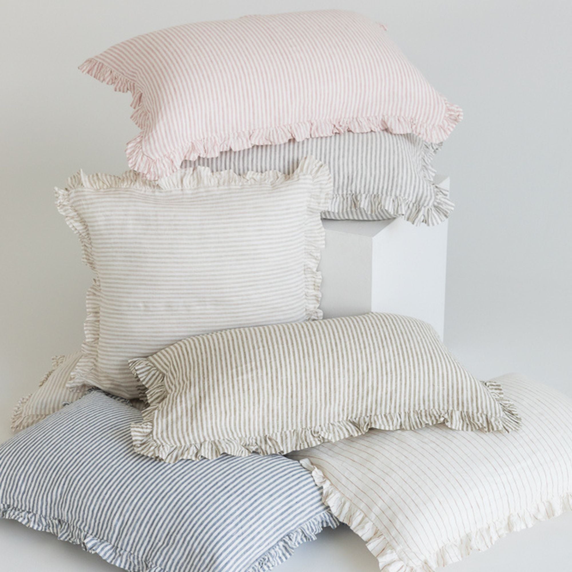 Add an instant touch of the 'Wow' factor to your bedroom with our beautiful new Ruffles Collection! This range of French Flax Linen pillowcases and cushions provide instant texture and a hint of whimsy to your bed. The dash of striking green in our Olive Stripes Ruffles elevates your home and brings everyday luxury to your spaces. Beautifully textured and stonewashed for softness, we love Olive Stripes with Olive, Ginger Honey & Natural.